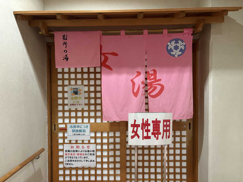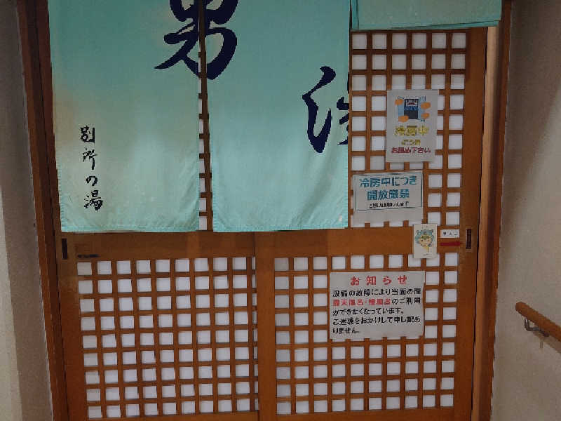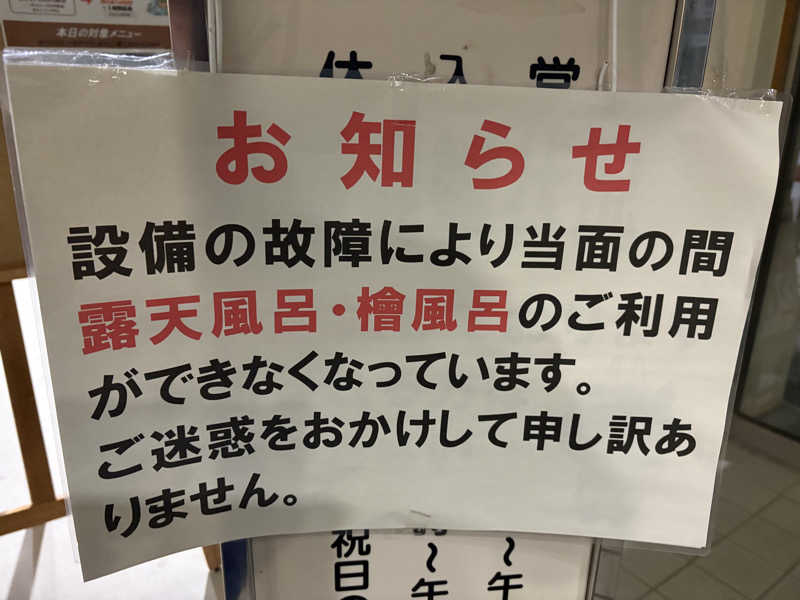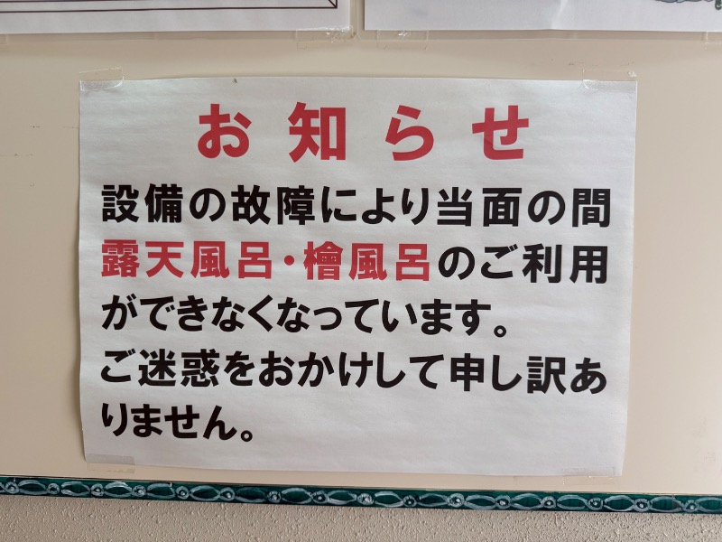露天風呂と檜風呂が使用出来ないとの告知あり。