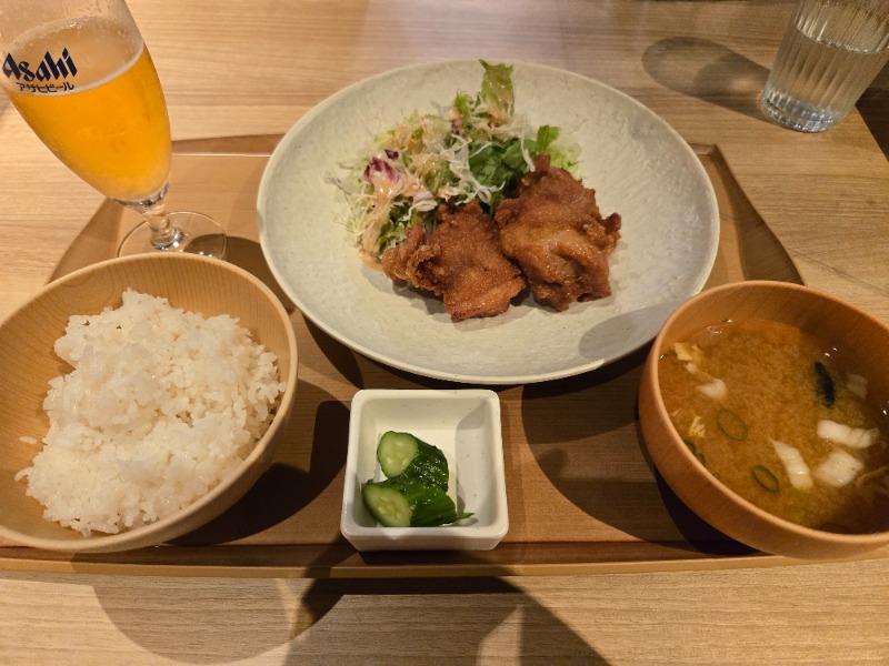 いつも唐揚げ。ビールはアサヒでした。豚肉のカレーうどんも出汁が美味しくて、ご飯を入れて汁を全吸い