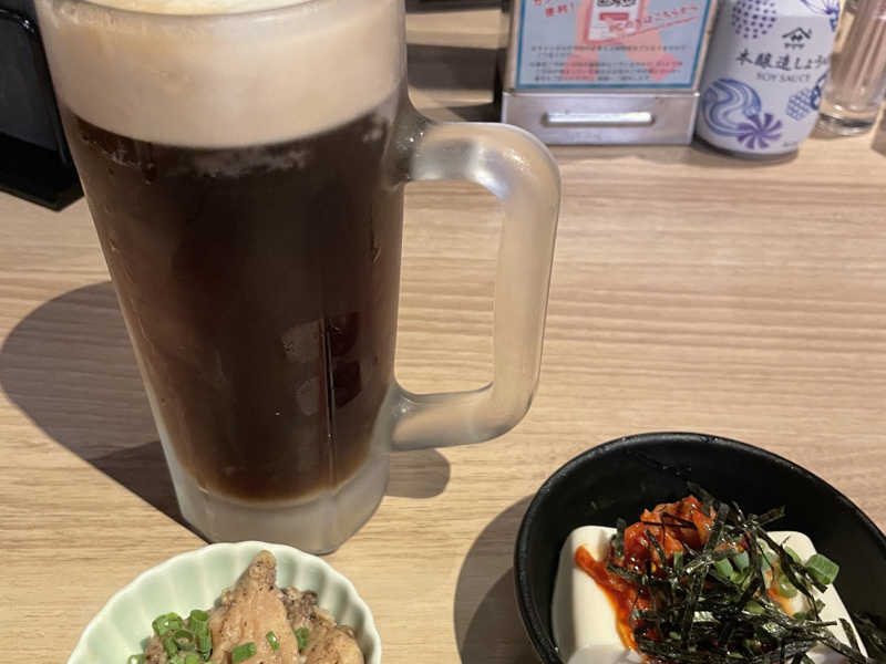 エクストラコールド&冷ややっこ+鶏ハラミ。サウナ後のステキな一杯!
