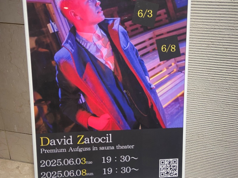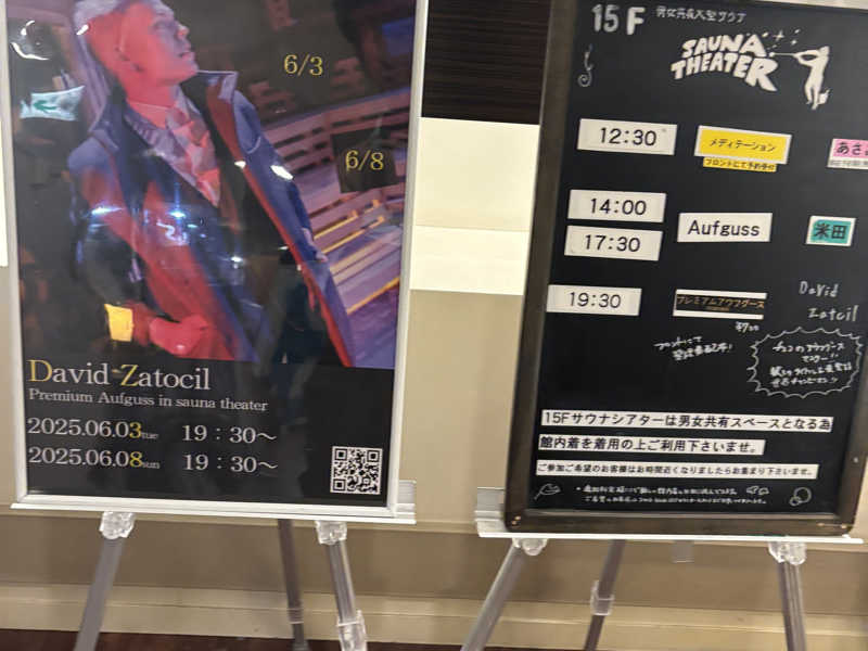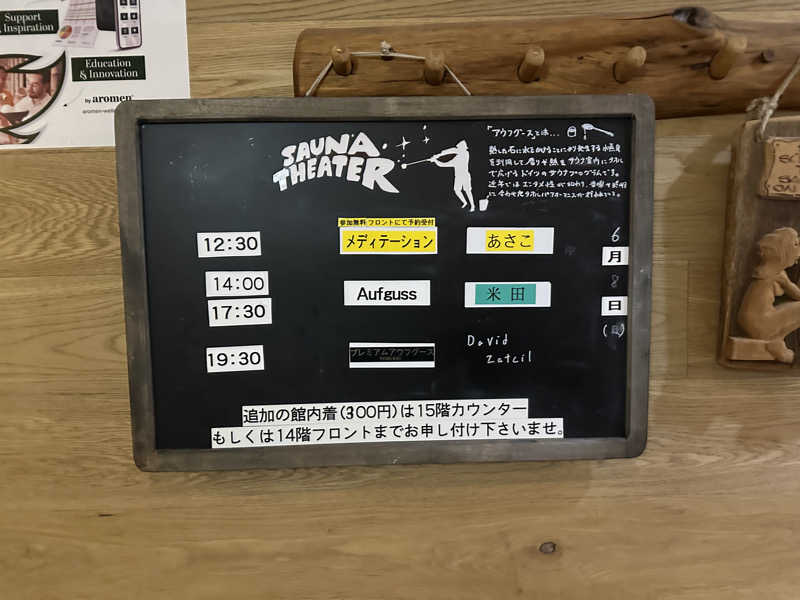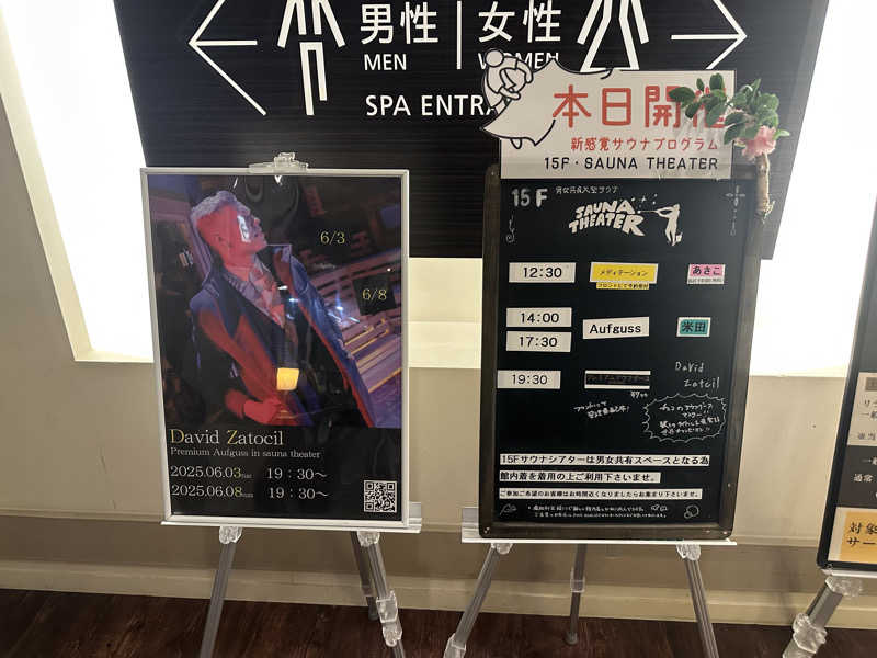 前日に幕を閉じたACJ2025の興奮が冷めやまない中、デイビッドさんによる日本でのラストアウフグース!夜にイベント開催だったので昼間は関東のサウナを楽しもうかなとも悩んだのですが、ACJで相当な体力を使い果たしていたためスカイスパでゆっくり過ごそうと昼過ぎに入館。入場規制がされていたのですがイベント予約していたためスムーズに入れました。少し横になって休んで14:00岡見さんのアウフグース!ACJでは個人団体ともにイタリアの世界大会行きを決めた超超凄い方👏爽やかな香りで力強い岡見さんらしい扇ぎでした!ACJに出場者された選手の皆さんは大会が終わって翌日にはもう所属の施設や遠方に出向いてゲストとして扇がれている方もいて休む暇無くアウフギーサーとしての仕事を全うされていてほんと頭が下がります🙇