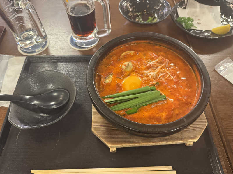 韓流フェアのメニュー。麺はインスタントっぽいけど牡蠣、ニラ、ネギが入っていて美味しい♡