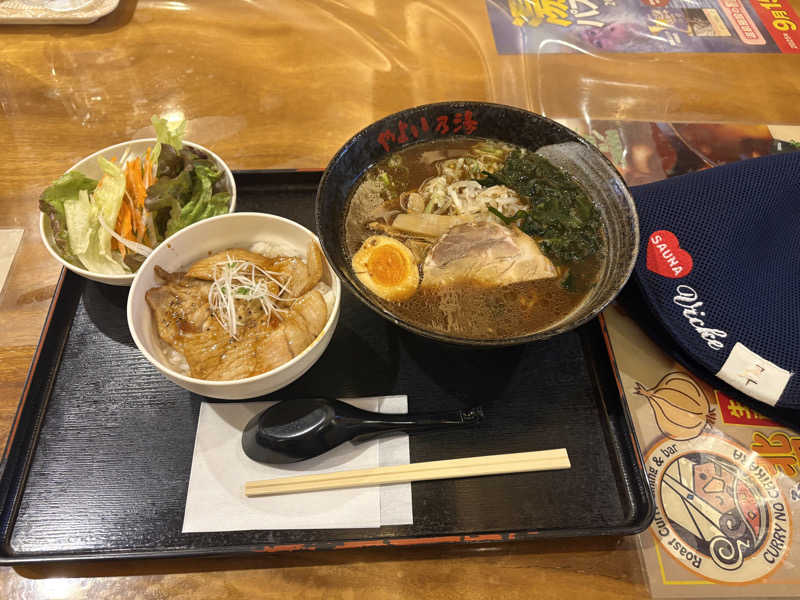 ラーメン(醤油をチョイス)、ミニ丼(豚丼をチョイス)、サラダが付いてきて1380円?