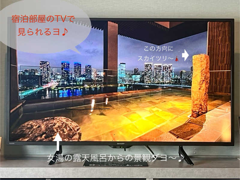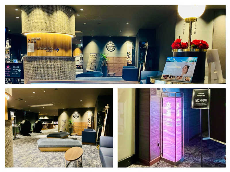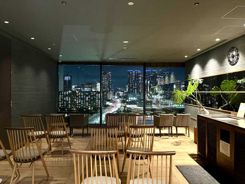 浴室内はシック&モダンな色調でアーバン感を高めていて、BGMは浮遊感のあるヒーリングミュージックでおだやかな気分になるのか騒ぐ人もしゃべってる人も皆無で静かに夜景を眺めてお風呂とサウナを楽しんでいてとってもおだやか。