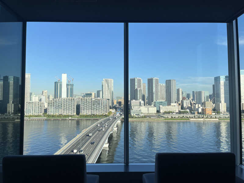 男湯は豊洲市場、レインボーブリッジ側の湾岸エリアを向いた景観で、女湯は晴海月島側を望む景観。