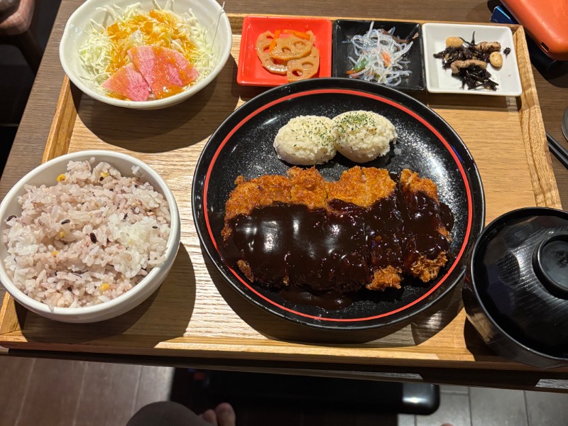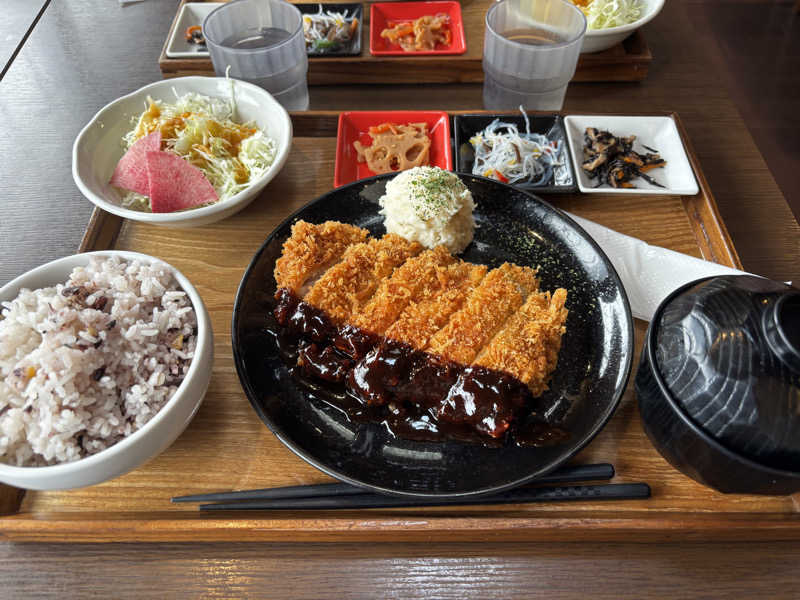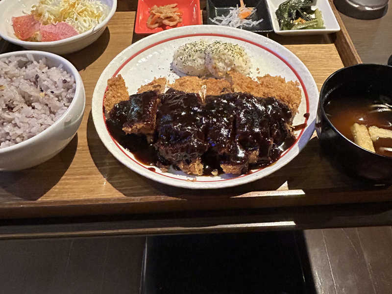 揚げたてのカツがさくさく。味噌のソースは甘く濃口で○!箸休めの小鉢の種類も多いのがすき。