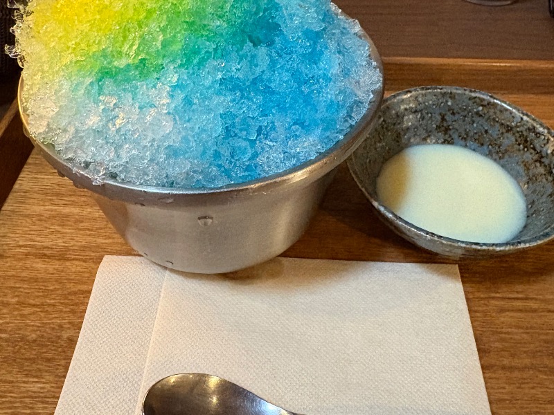 ダイエット中につき氷菓をば。5種のシロップをかけ放題。今日はブルーとレモンを。練乳かけて食べ応え凄い