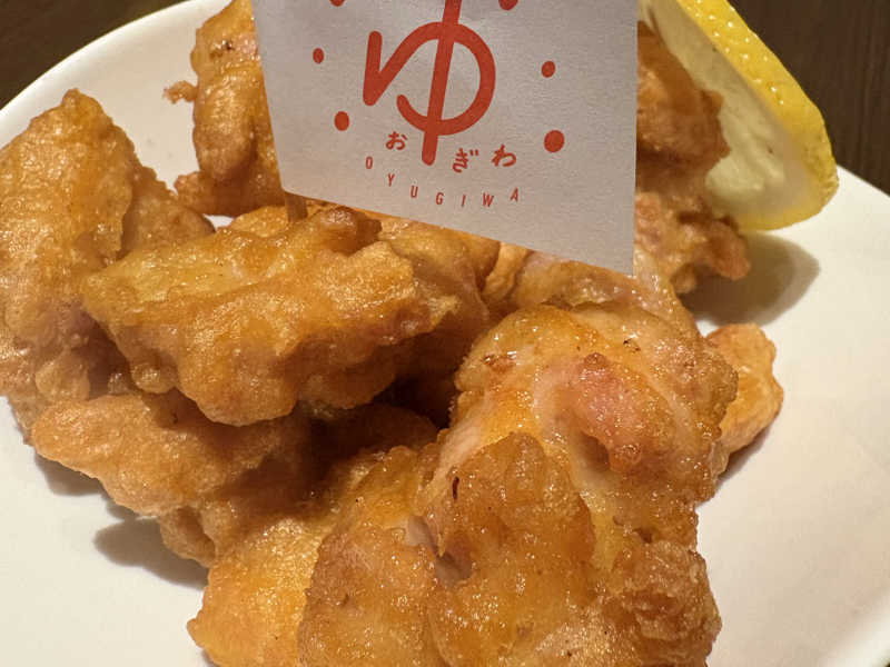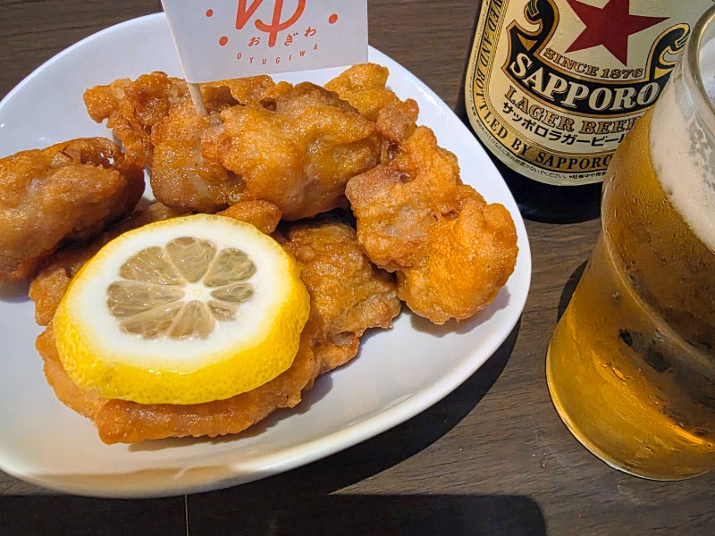 オユギワ唐揚げ 8周年で唐揚げ8個 ころもがカリッと、スナック感覚で食べられる。
