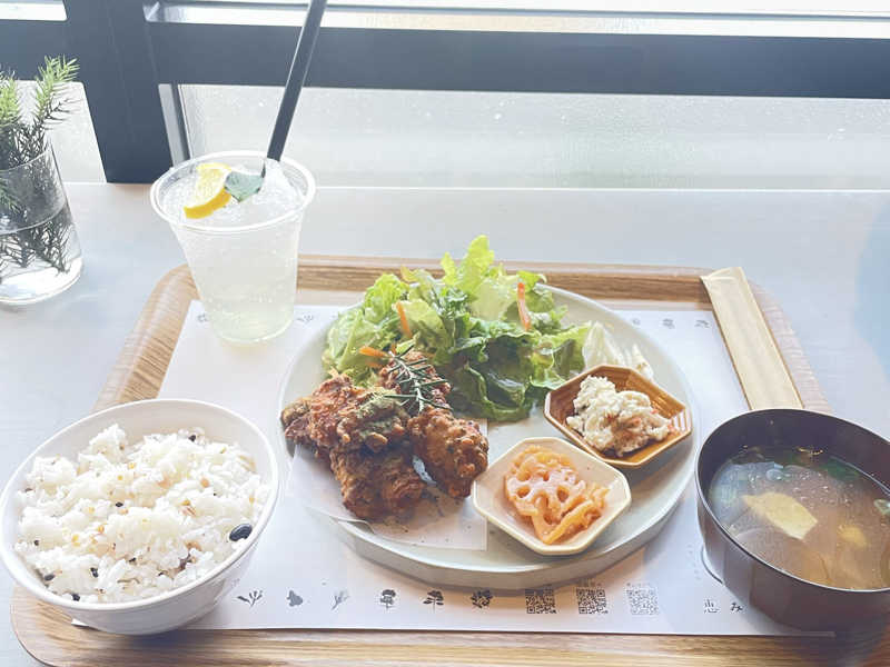ハーブ唐揚げ定食にローリエガーリックとハーブを追加でフリフリ。 さらにいつものドリンク🥤 🌿最高。
