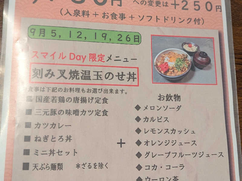 入浴料金➕お食事➕ソフトドリンクでこの値段 味噌カツ定食とレモンスカッシュを注文しました(*^^*)