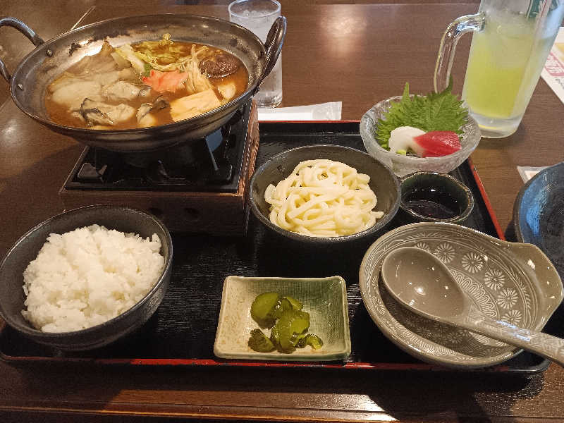 牡蠣の味噌煮込み鍋膳に豆腐サラダとアクリをいただく