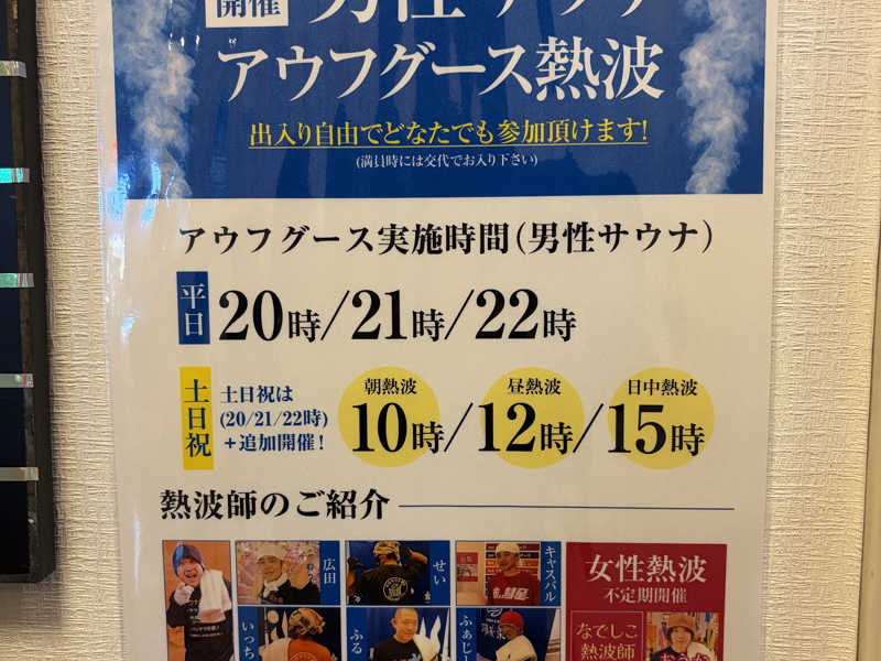 タワーサウナなので上の段にも移動してタオル振ってくれたり、動き回りながらのアウフなので大変そうだけど、いつも通りパワフル、ノリノリアゲアゲ熱波を頂きました!(途中で換気してくれたけど、ここのサ室はタオルを振る方が熱くて大変そう)