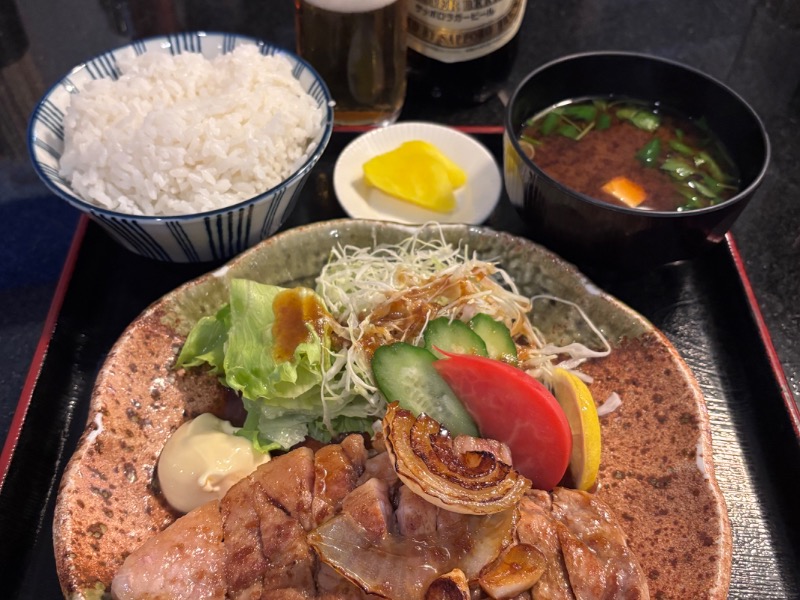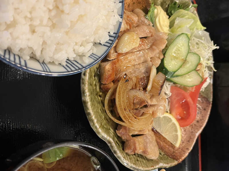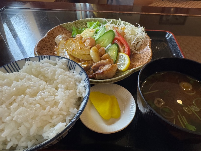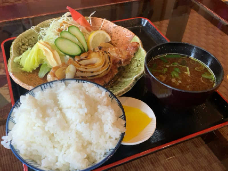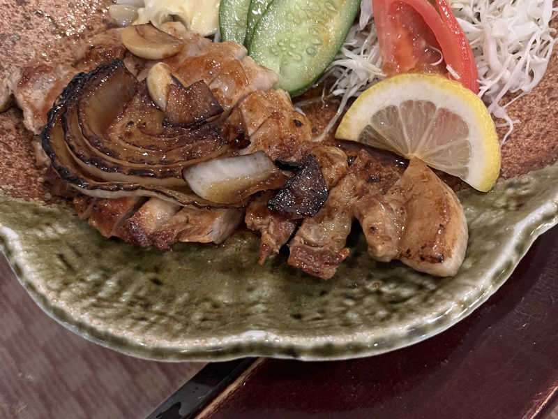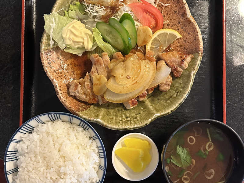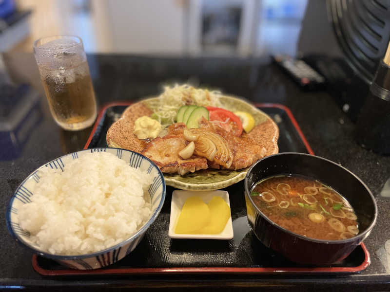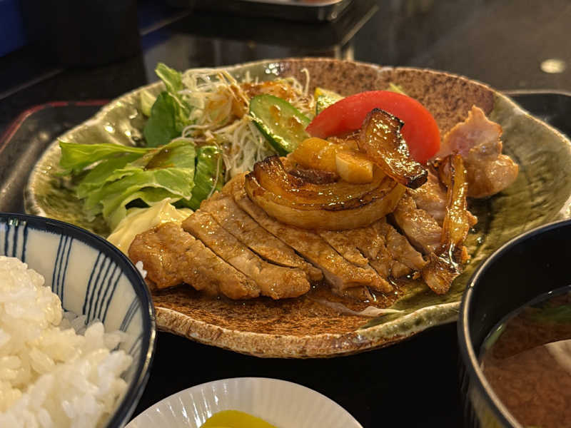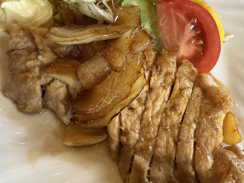 トンカツより薄いが厚切りで食べ応え系。ニンニク風味でハードなサウナにピッタリな味付け。サ飯感強めで◎