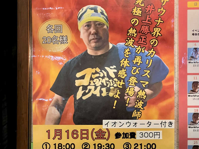 19時30分、井上勝正さん熱波。入口でイオンウォーターを頂き、サウナ室内で飲んでOKと何ともスペシャルな時間でした。10分前に整列して入室、そのままイベント開始。