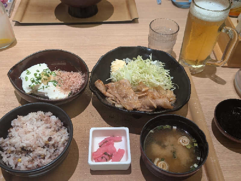サウナ後の生姜焼きは格別! ご飯とおぼろ豆腐も美味しかった〜