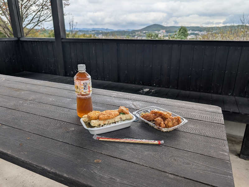 露天で秋風を浴び、休憩椅子を把握。数は多いので大丈夫👌露天からアウトレットモールが見える。露天に「漢方塩サウナ」なる気になるものが目に入りこれを〆にしようと決める