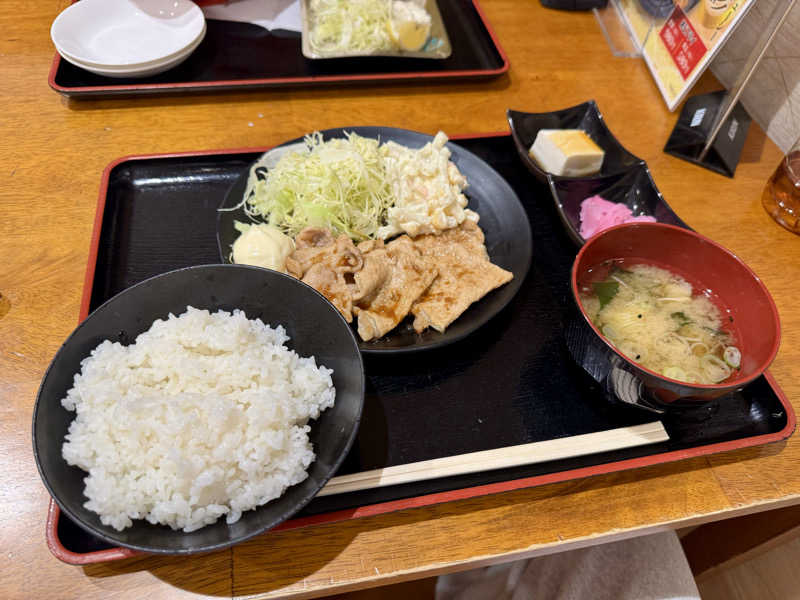 久々の施設定食。サウナ上がりにお味噌汁の塩分と生姜焼きの濃い味付けに胃が喜んだ
