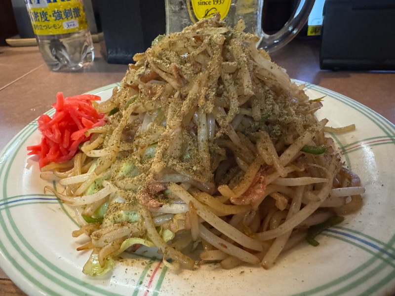 魚粉が掛かってる焼きそば。 麺も歯応えがあって美味!
