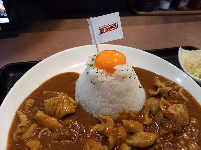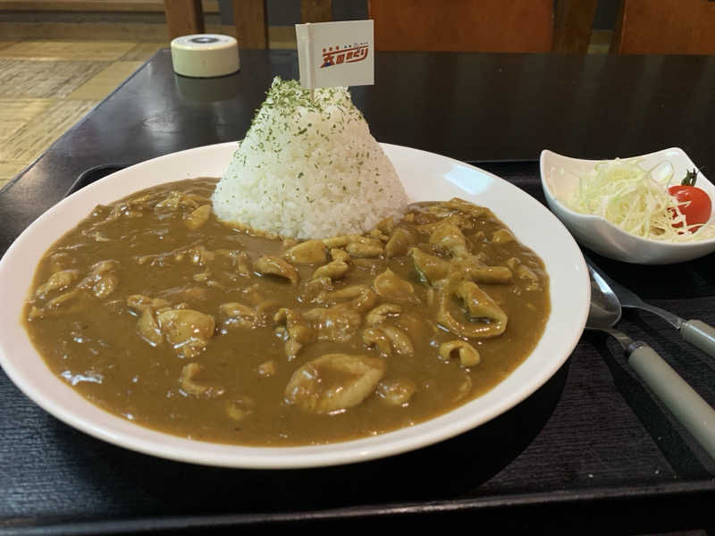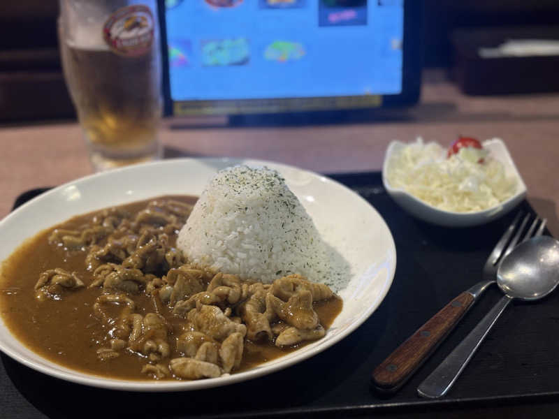 ホルモンとカレーのマッチがよいね。この時期、天国めぐりの旗付き。