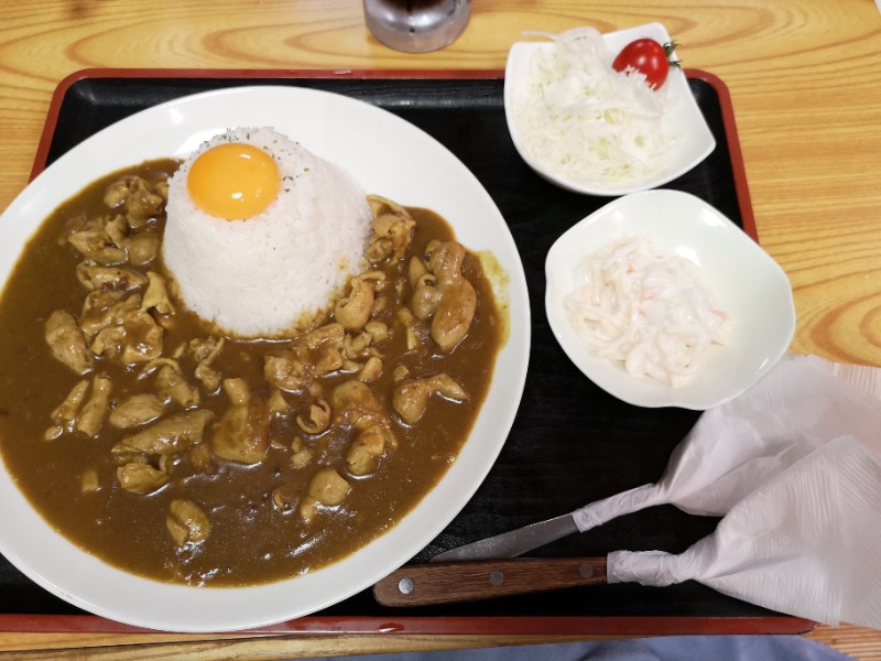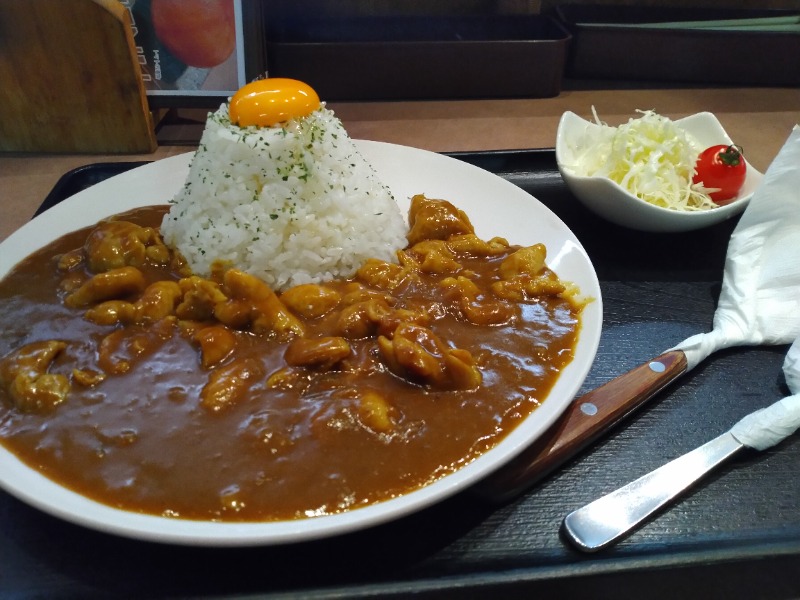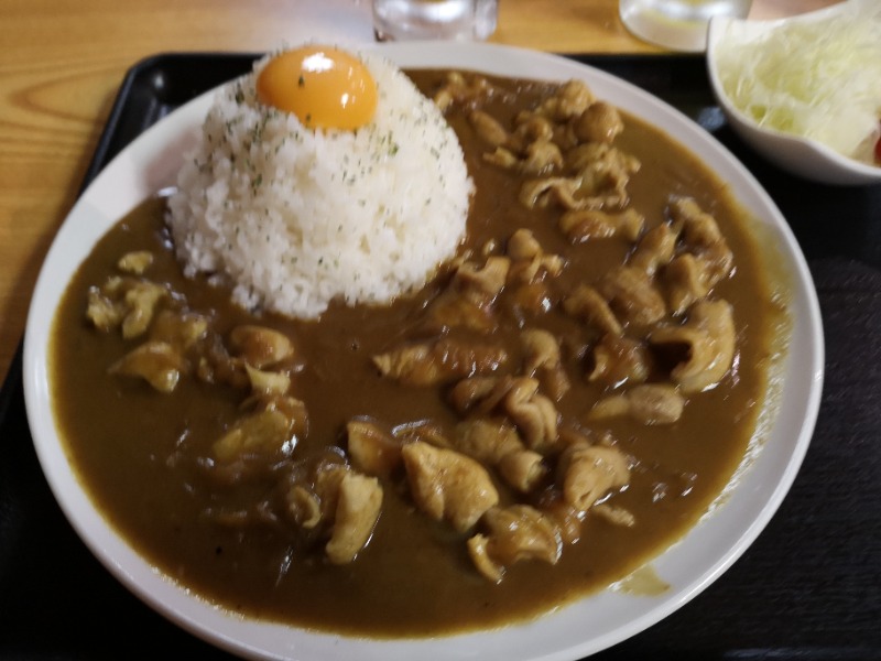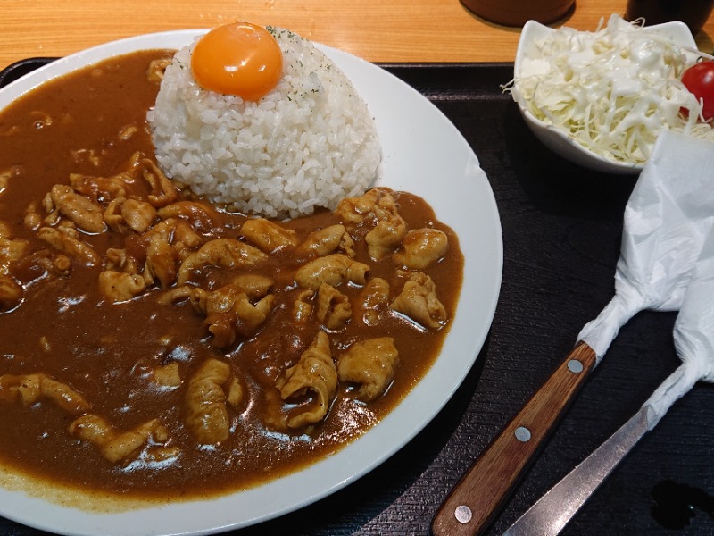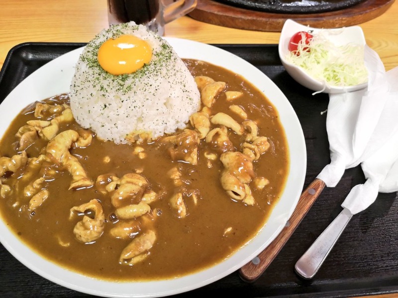 富士山もつカレーに玉子の黄身がのったバージョン。自家製のルーなんだとか。マイルドな味付
