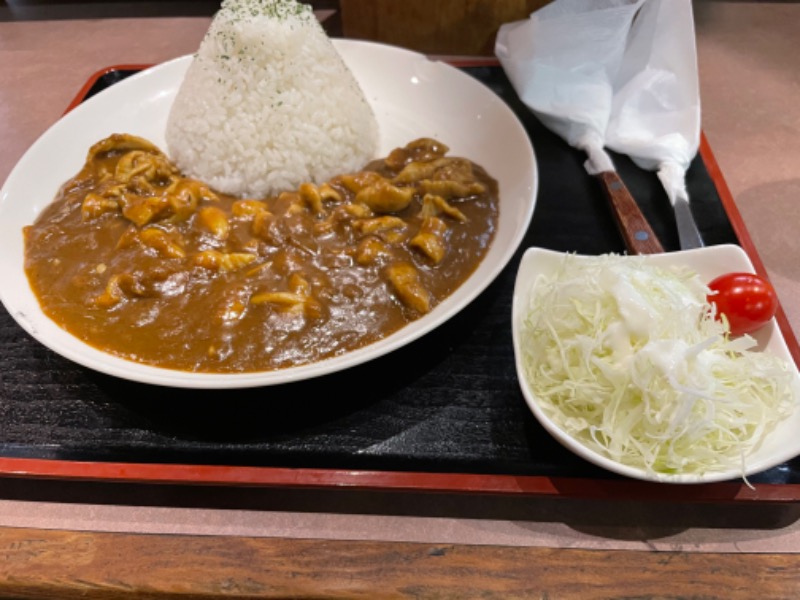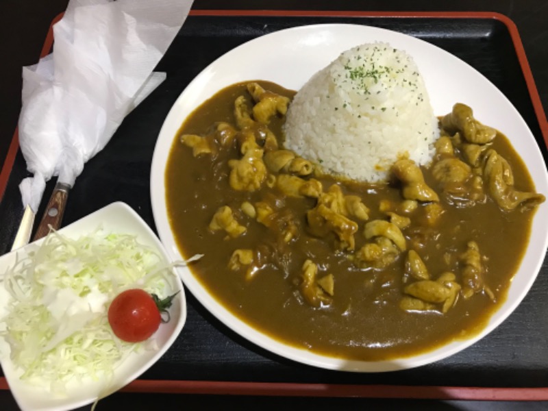 サウナ室の手作りの表記を見て👀ついつい注文😁ルーの味がたまらない😋もつもたっぷり😍