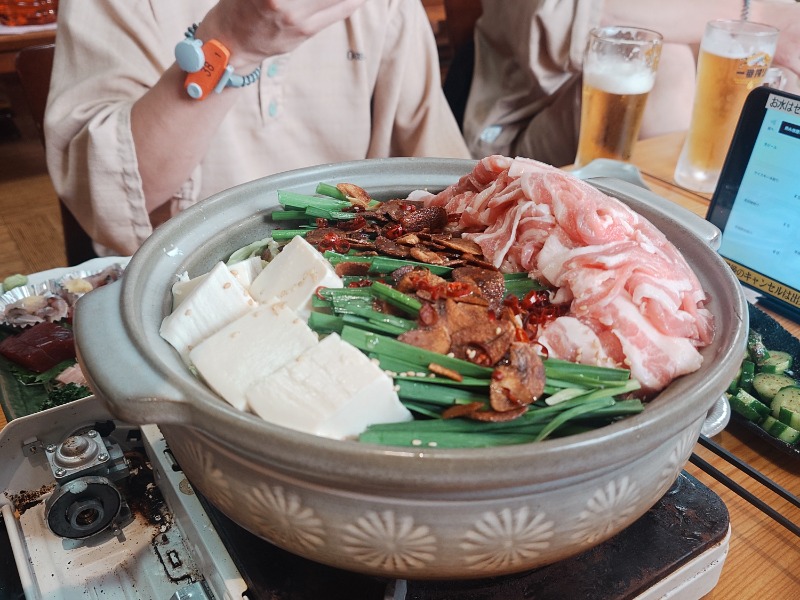 宴会専用メニュー。鍋は水炊きや定番もつ鍋からグループ単位で一つ選べる。肉が沢山入っていて美味かった!