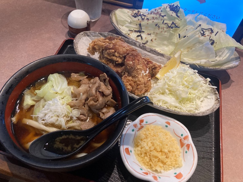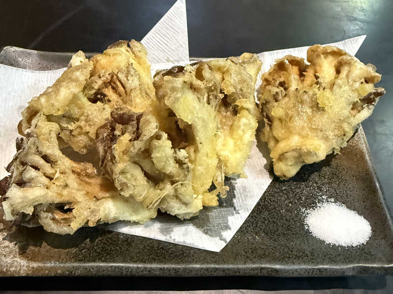 肉かすの風味と焼きそばがマッチして最高!舞茸天はジューシー+サクサク!鶏皮からあげは酒が欲しかった笑
