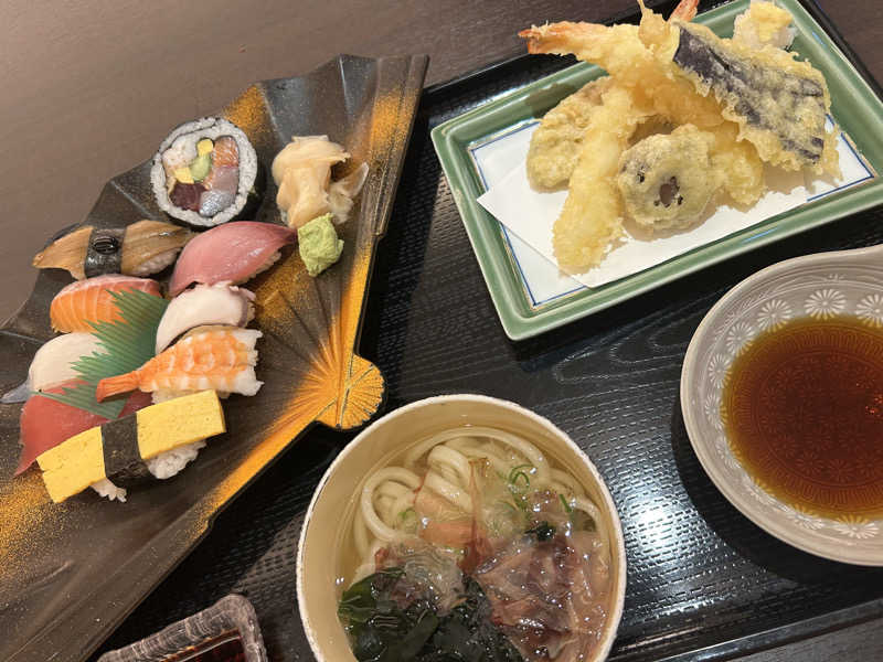 うどん、天ぷら、海鮮丼が食べれてレンタルタオルもついて1800円はコスパ最高!