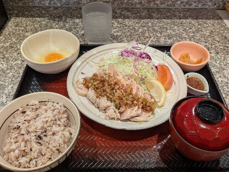 今日のランチは、蒸し鶏の生姜ねぎ醤油(五穀米)に生玉子トッピングして美味しく頂きました✨