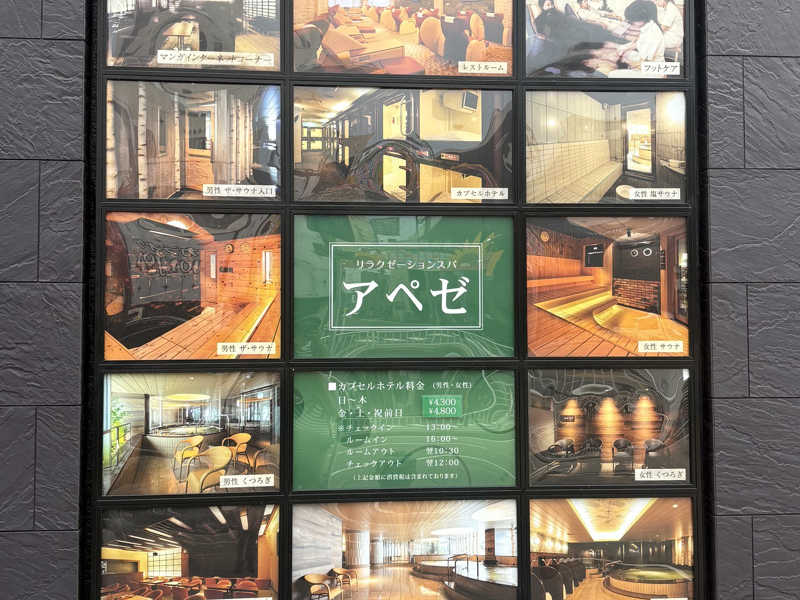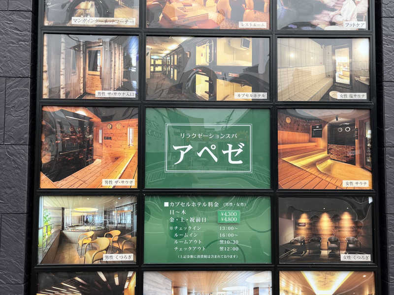 ご飯が食べれて、お風呂に入れて、のんびり出来そうな施設を探したところ、初訪問のリラクゼーションスパアペゼがコスパも良さそうだったので、こちらへ🖐️