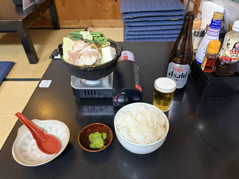 もつ鍋は1人でちょうどいい感じのボリューム。ドリンクセットはつまみ付きで500円と間違えました。