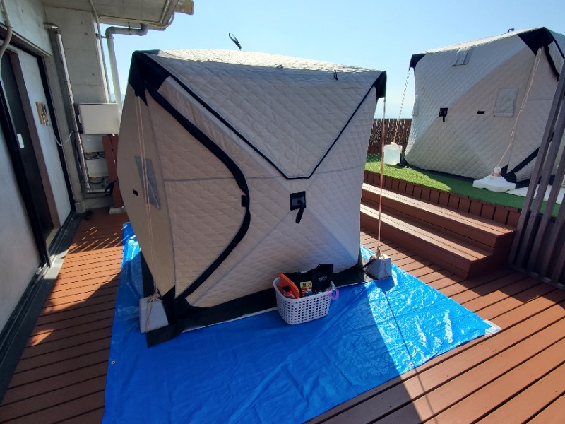 内風呂でサーっと身体を流して、サウナ用パンツと速乾シャツに着替えて諸々荷物を持って屋上テントサウナへ。