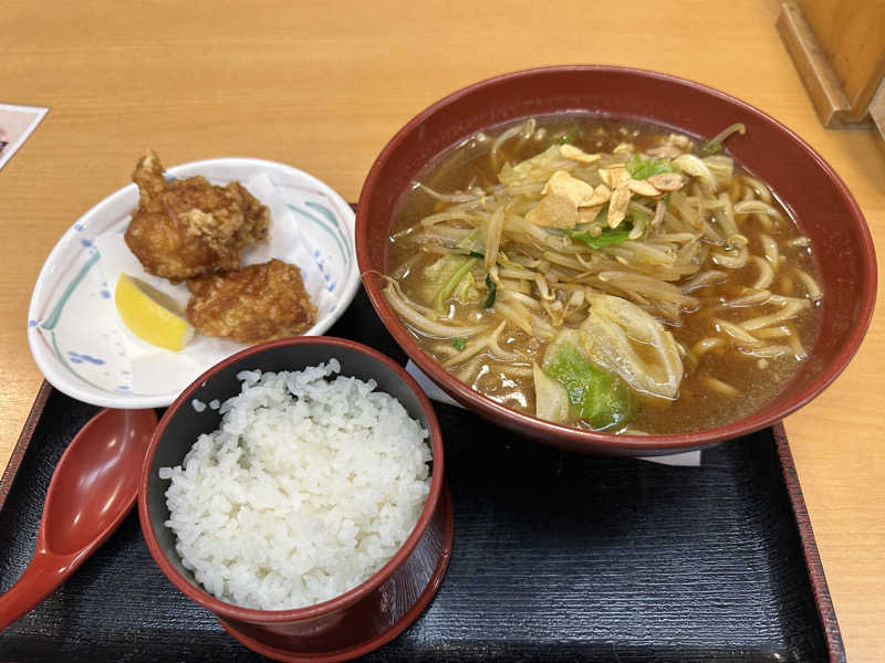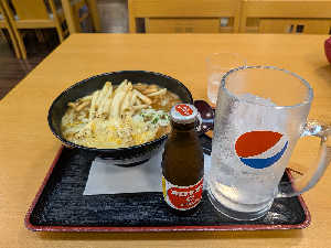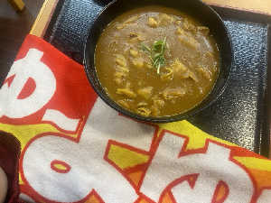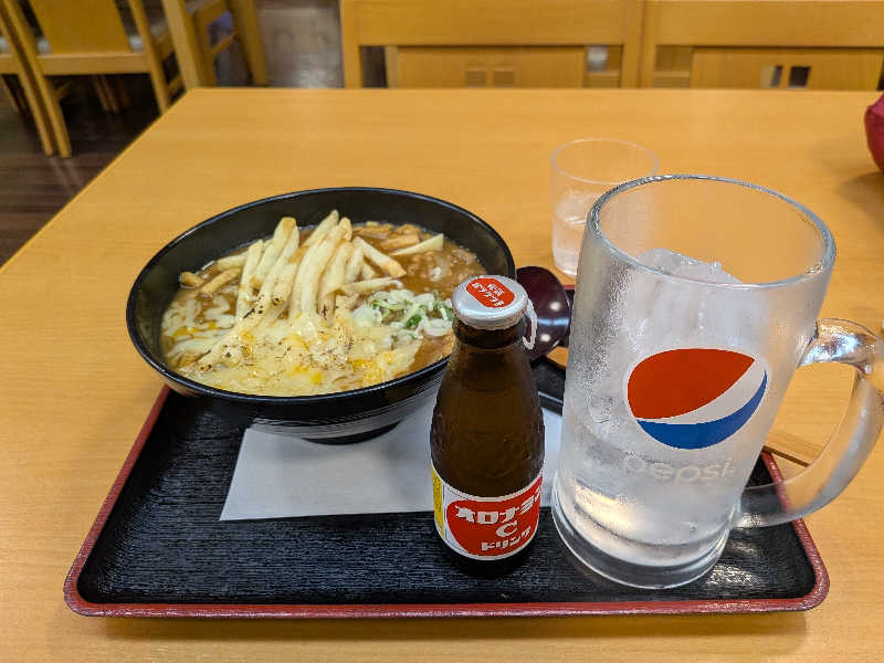 カレーうどんにフライドポテトとチーズと油かすを入れたボリューム飯。意外に出汁が優しく効いています