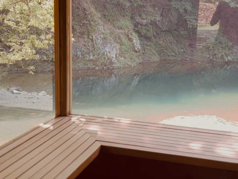 ミント水風呂には1000人分のミントティが取れるともいう巨大なバッグが3つ。香り高く水温も良く、ずっと入っていられる。目の前に流れる美しい河へのダイブもそっちのけで、気がつけばミント水風呂に脚を入れる自分がいた。