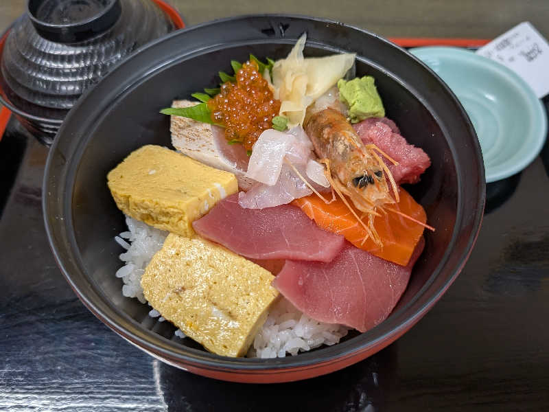 駿河丼と迷った挙句の海鮮丼。めちゃ新鮮で美味い! 配膳の猫ちゃんロボに癒される