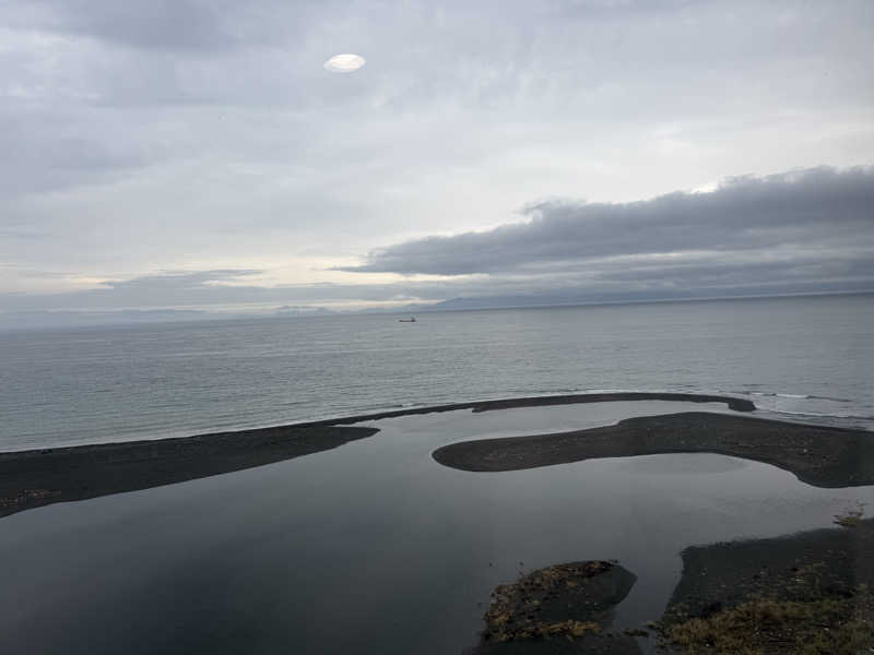早々に洗体を済ませ、静かなフィンランドサウナ室へ。曇り空の隙間から太陽光が漏れ出して海面を明るく照らす。