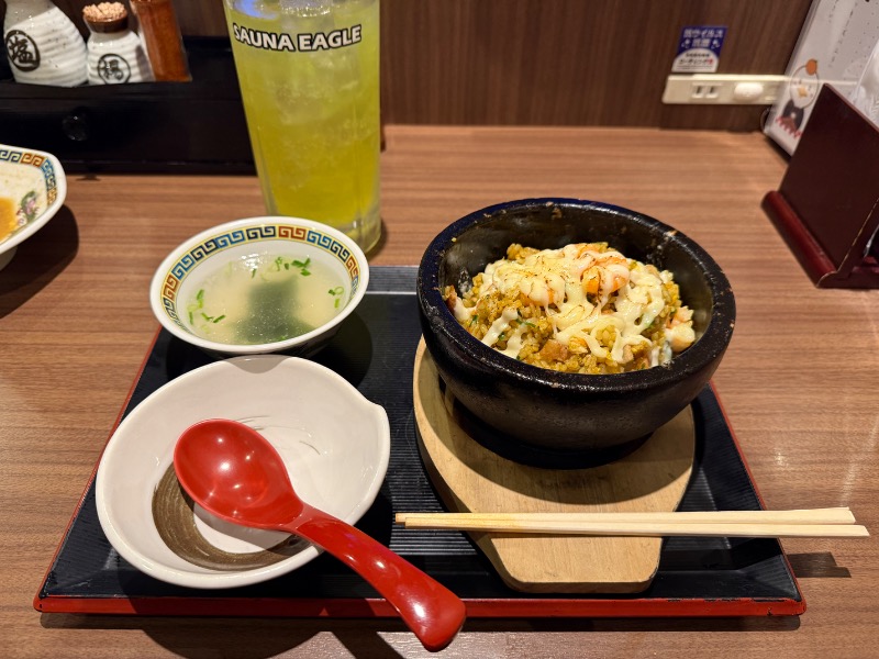 ロウリュの日限定メニューで注文 カレー味で海老もしっかり入っていてさっぱりな味で美味しく頂きました