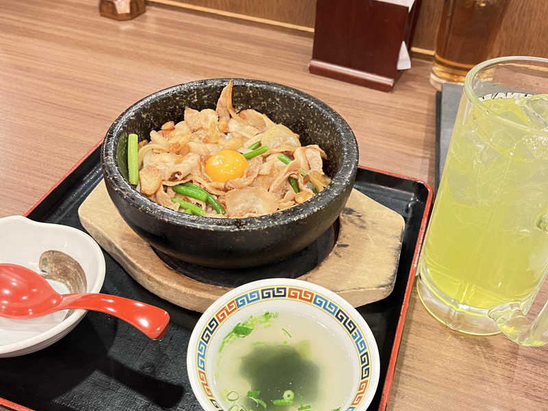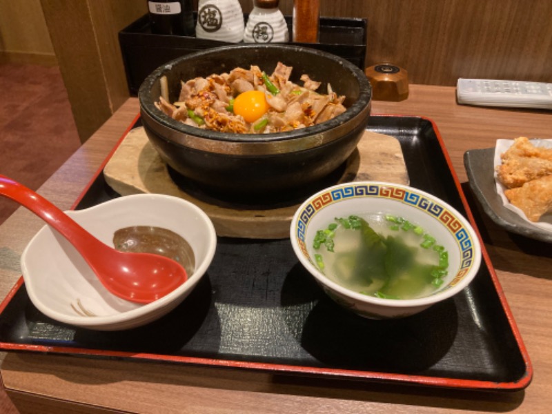にんにくゴロゴロの石焼き釜でアツアツ。 味濃くて美味い。