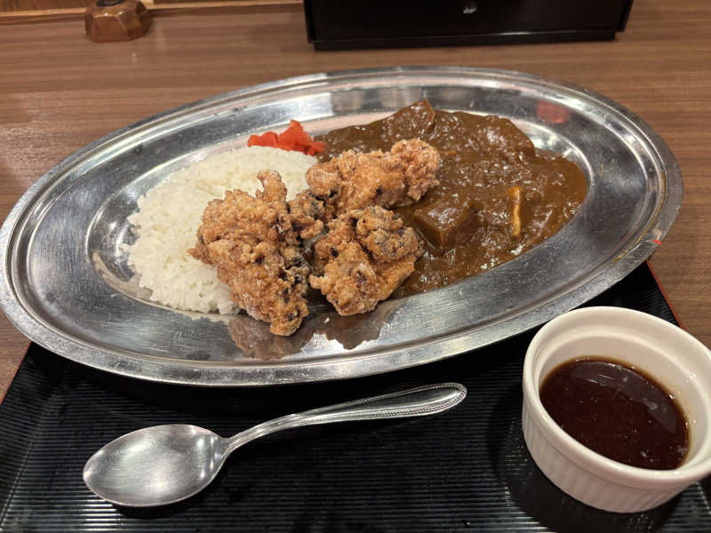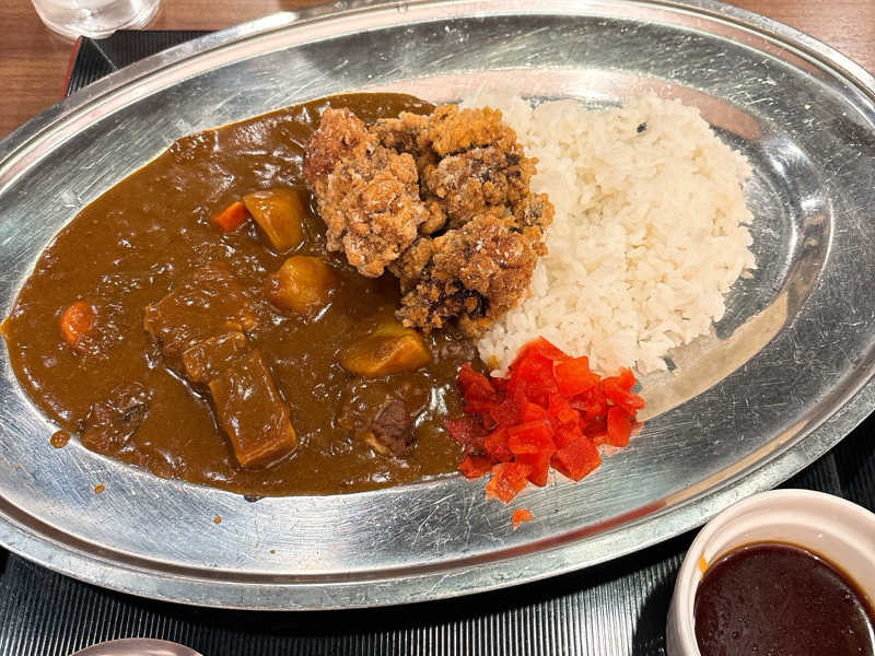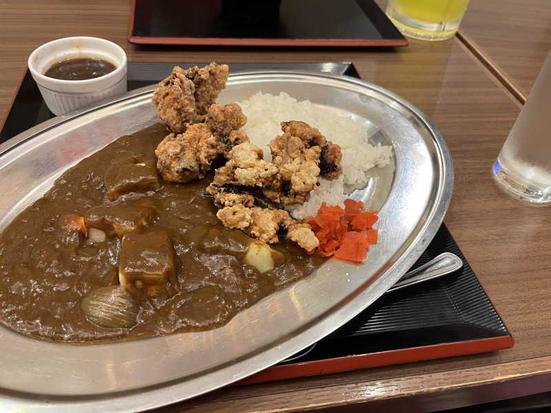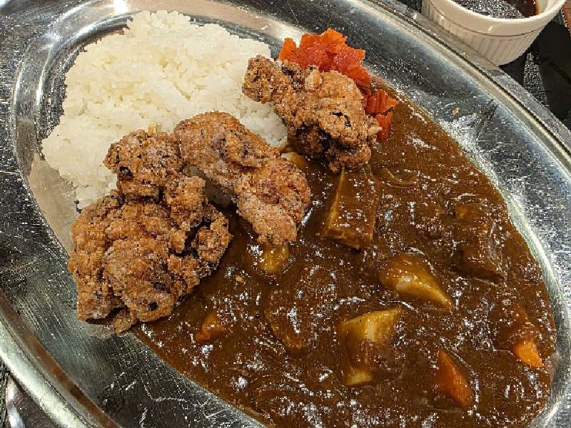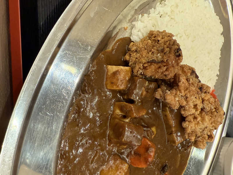 唐揚げ、カレーに肉、野菜がゴロゴロ入っていて、ピリ辛感が最高!