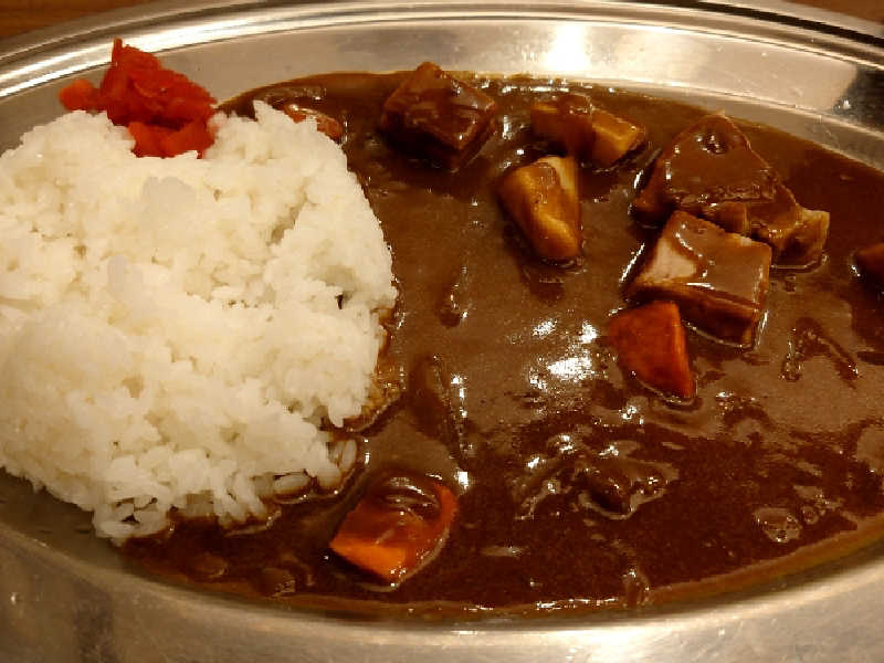 朝からカレー。若干ご飯硬めでした。