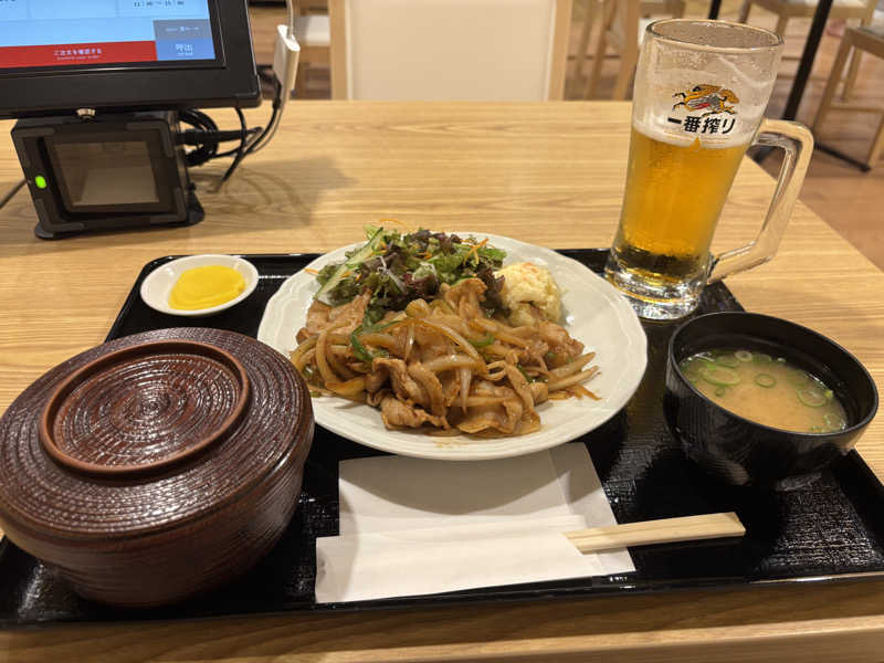 肉厚で柔らかポークの甘辛い味付け。サウナに備え、まずはノンアルで腹ごしらえです