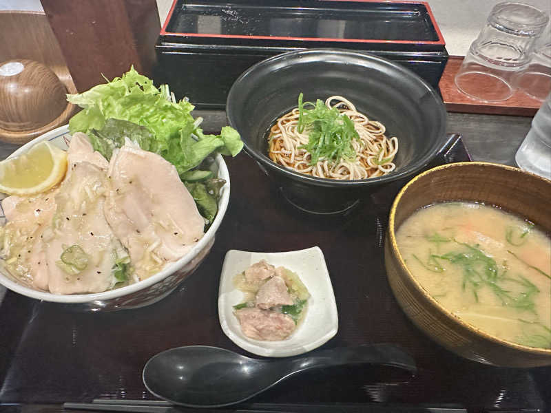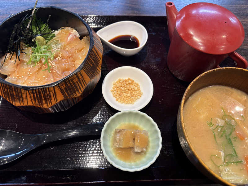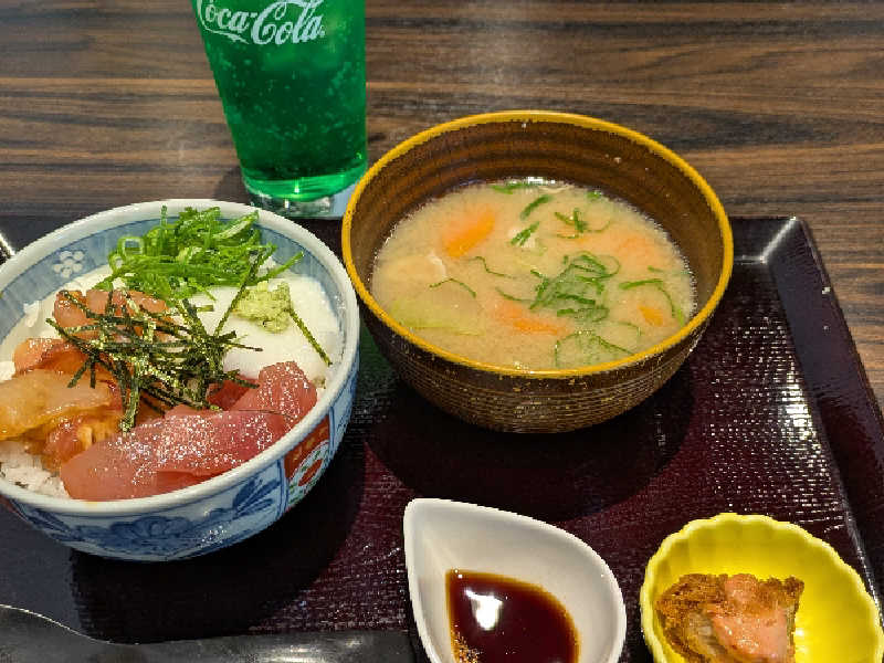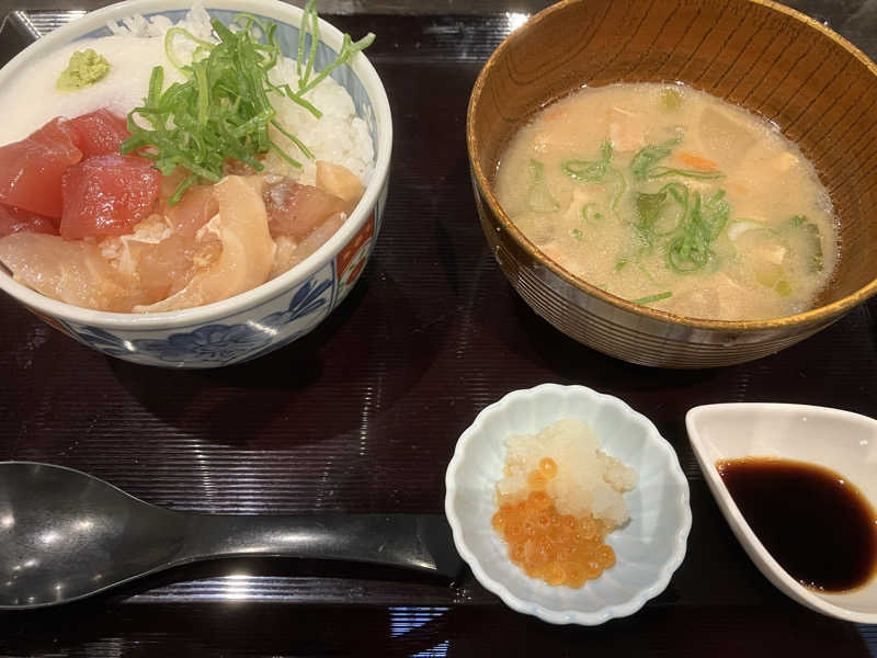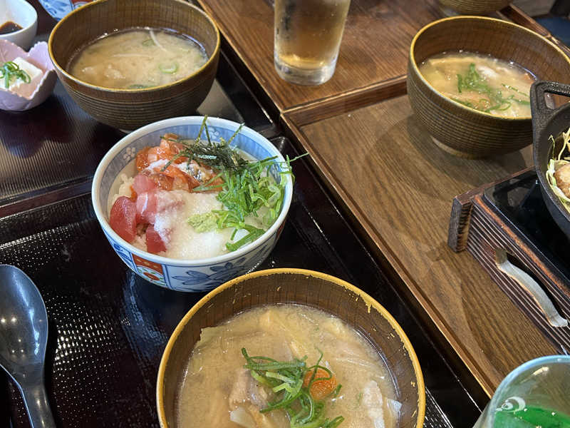 まぐろとサーモンととろろ 豚汁も美味しいし満足✨️