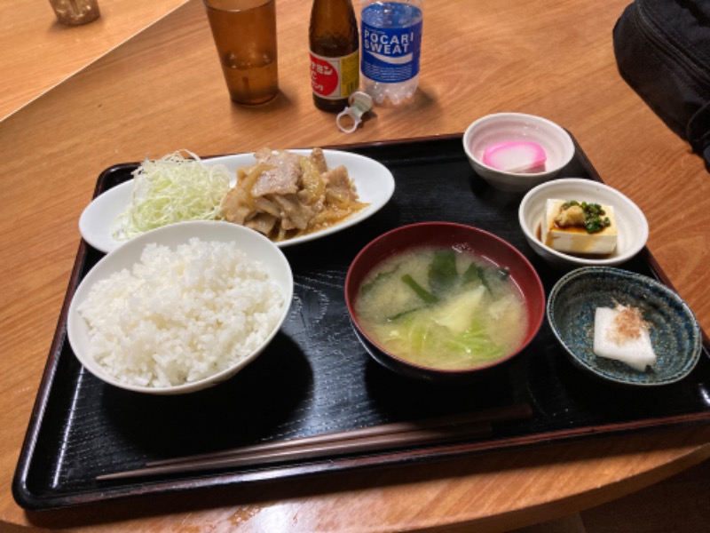 山盛りご飯が美味しい。自販機でオロナミンCとポカリを買い、置いてあるコップに自分で混ぜる。