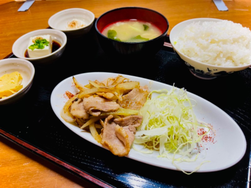 生姜の効いたあっさりめの生姜焼き定食 さっぱりののんある晩酌レモンサワーによく合います