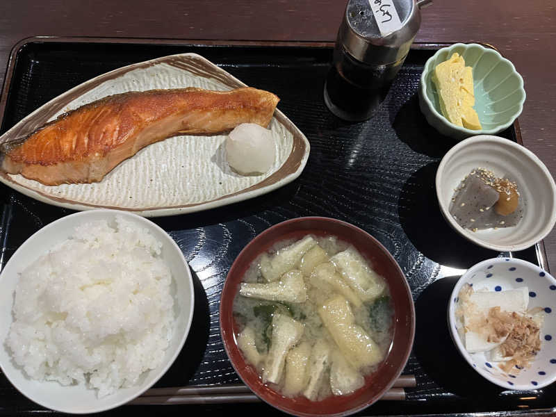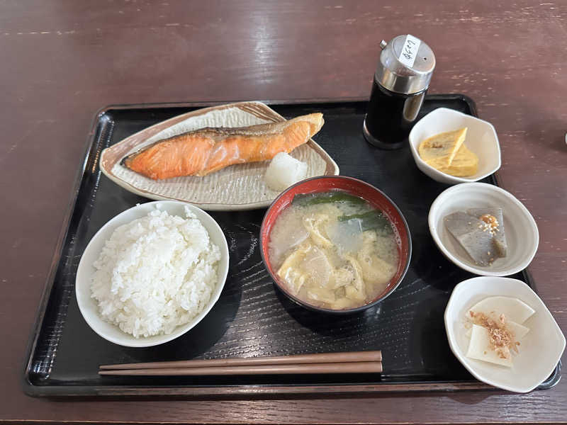 しきじの朝メシはコレ。鮭が分厚いし脂も乗ってる、大根入り味噌汁もウマい!