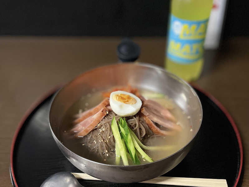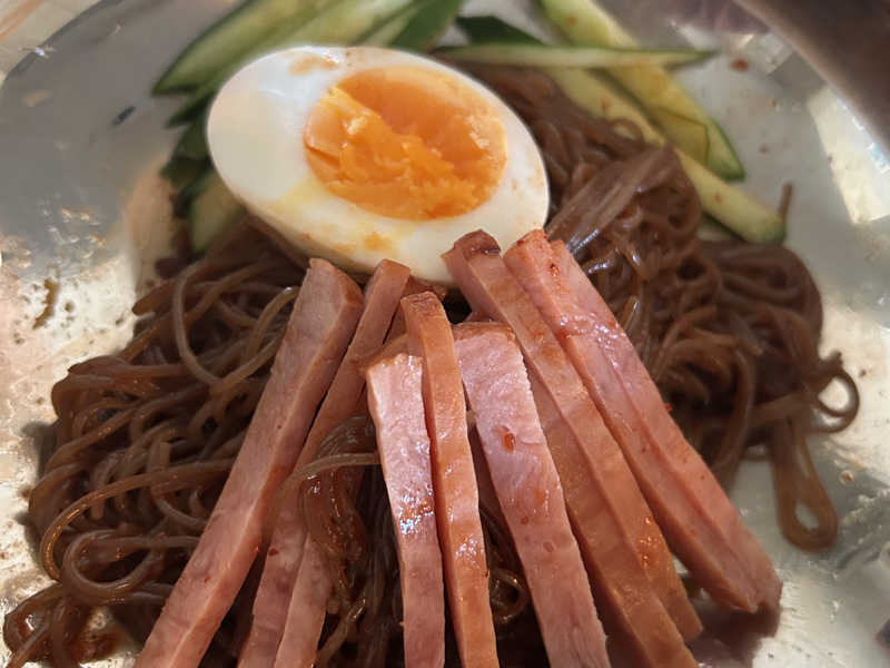 酸味の効いた爽やかな味付けに黒い珍しい麺。マッチのシュワシュワ感とあいまり、喉越しスルスル。よき。