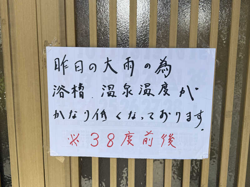 先日の観測史上最大雨量1時間当たり123ミリの影響で湯の温度が少し低いとHPでアナウンスされていたが、通常営業とのことなので行ってきたこんにちは。