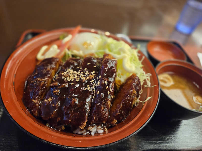 ソースカツ丼に温玉と野菜が乗っています