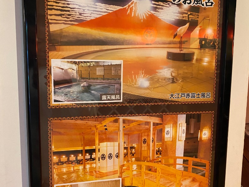 リアルな鶴のオブジェと立派な赤富士の壁画が見事!