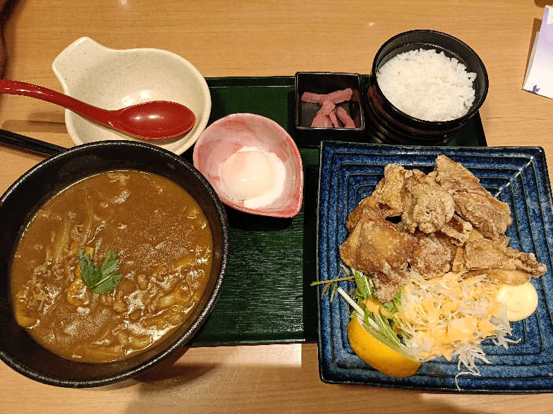 揚げたての唐揚げとサウナあがりに嬉しい濃いめの味のカレーうどん。