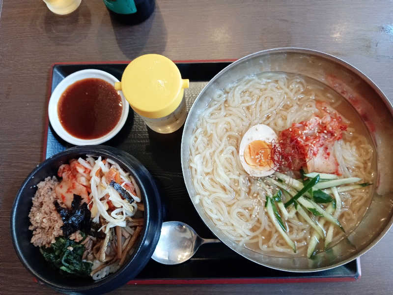 冷麺の麺がシコシコで、優しい味。対して、ビビンバが甘辛くて、美味しかった。暑い日には良いですね。